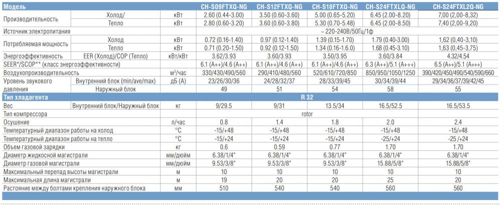 Запуск при низких температурах позволяет обеспечить диапазон работы кондиционера CH-S09FTXQ2-NG в пределах от -15С до 24С – на обогрев и от -24С до 48С – на охлаждение.