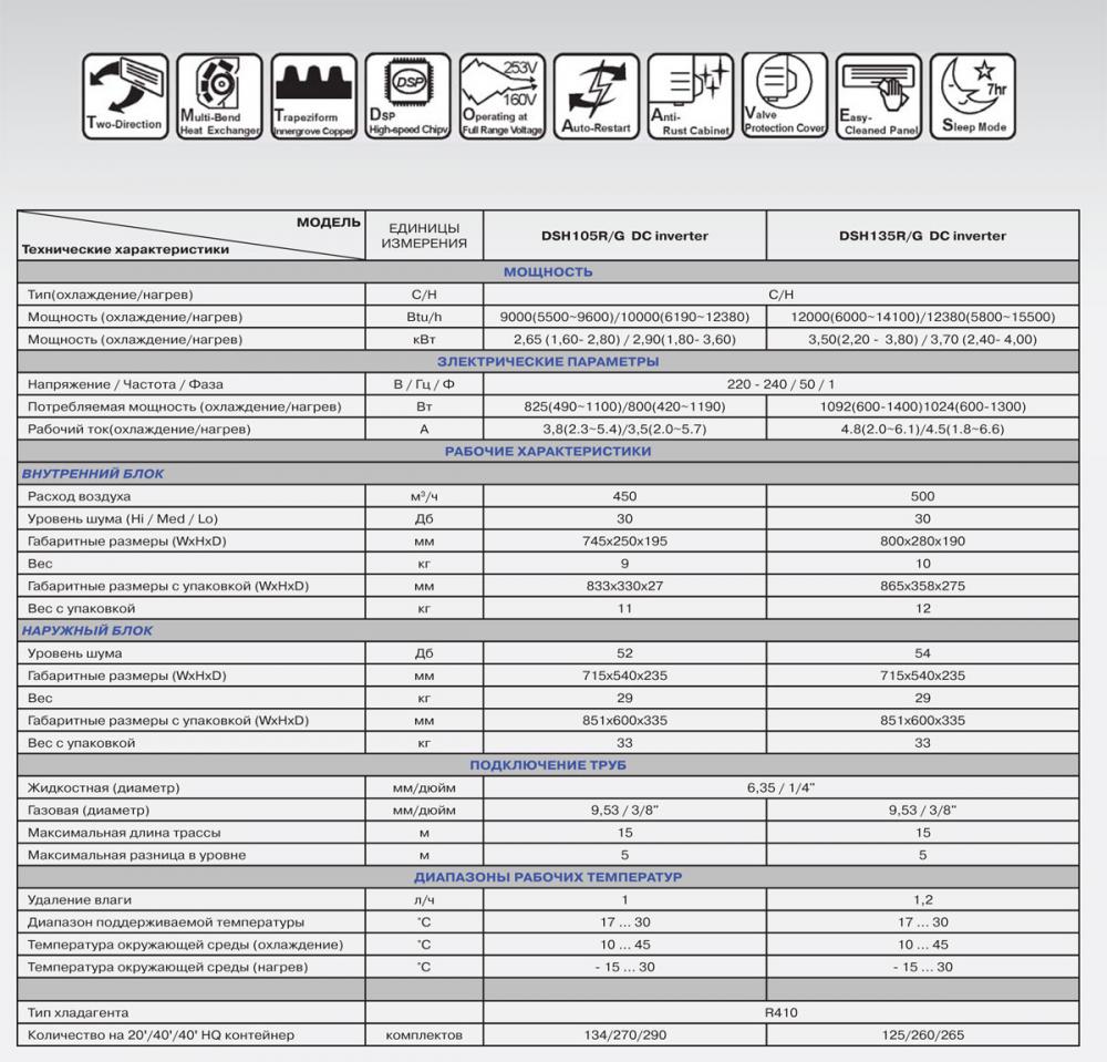 Кондиционер DSH135R/G DC inverter работает на озонобезопасном фреоне R410a, не загрязняющего окружающую среду. Вы можете купить кондиционер с другим типом хладагента, сделав выбор на нашем сайте.