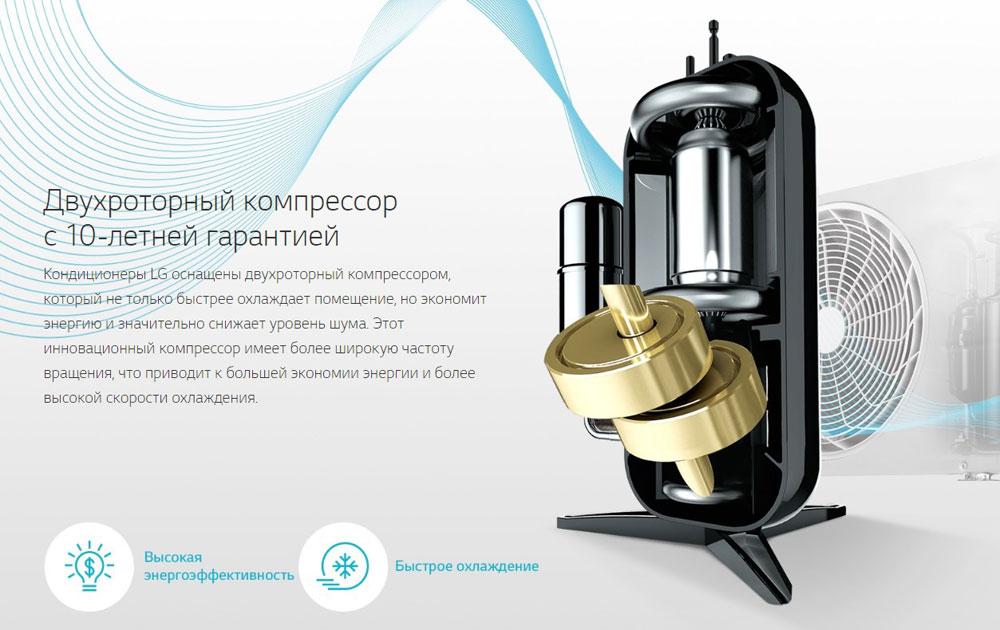Инверторная технология Dual Inverter, используемая LG, обеспечит эффективную работу AC12BQ.NSJR / AC12BQ.UA3R, чем существенно сэкономит энергию. Компрессор Dual Inverter плавно регулируя температуру воздуха, создавая комфортные условия, обеспечивая низкие шумовые характеристики и отсутствие пусковых токов, быстрее охлаждает и работает дольше, чем обычные модели. Низкий уровень шума достигается путем снижения вибрации в компрессоре Dual Inverter, а снижение вибрации уменьшает вероятность возникновения трещин в трубопровод, что повышает надежность данного компрессора.