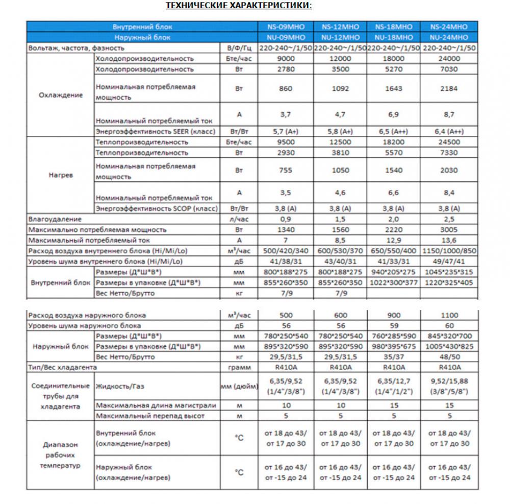 Класс энергосбережения подразумевает под собой то, что кондиционер NS09MHO / NU09MHO имеет сезонную энергоэффективность SEER 6,5 (A++), SCOP 3,8 (A+), а так же допустимые мощности от 9000 до 24 000 БТЕ/час.