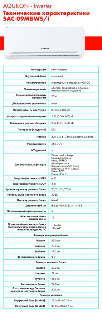 Кондиционер Sensei SAC-09MBWS/I серии AQUILON Inverter — инверторная сплит-система с современным стильным дизайном внутреннего блока, декорированный серебристой полосой. Модель имеет встроенный WI-FI модуль, работает на хладагенте R32, авто размораживание, функции самодиагностики и самоочистки, режимы Турбо, Авто и Сон, таймер, низкий уровень шума, оборев до -15С и многое другое. Другие модели кондиционеры Sensei Вы можете выбрать из каталога на нашем сайте.