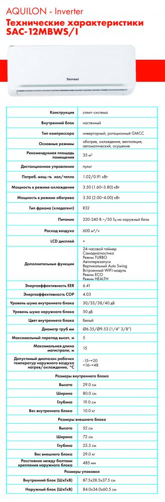 Кондиционер Sensei SAC-12MBWS/I серии AQUILON Inverter — инверторная сплит-система с современным стильным дизайном внутреннего блока, декорированный серебристой полосой. Модель имеет встроенный WI-FI модуль, работает на хладагенте R32, авто размораживание, функции самодиагностики и самоочистки, режимы Турбо, Авто и Сон, таймер, низкий уровень шума, обгорев до -15С и многое другое. Другие модели кондиционеры Sensei Вы можете выбрать из каталога на нашем сайте.