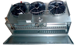 В качестве газового источника тепла воздушно-тепловых завес Тепломаш КЭВ-100П704G используется 4-х ходовой теплообменник, выполненный из бесшовных труб. Сам теплообменник выполнен из конструкционной стали с внутренним и наружным алюминиевым покрытием, толщина которого составляет 2мм. Обогрев помещения происходит путем нагревания газа внутри до 400С, а все продукты сгорания выходят через дымоход на улицу.